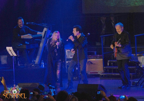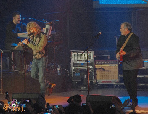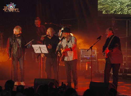Siguiendo con este espíritu, cuando Mario del Olmo salió del escenario le sustituyeron tres iconos de la música española de los ’70: Cánovas, Adolfo, y Guzmán. Junto a Rodrigo, ausente en el concierto, fueron en su día la réplica hispana a Crosby, Stills, Nash & Young. Salvo José María Guzmán, al que he tenido la oportunidad de ver en alguna ocasión junto a Sherpa y también en el musical “We Will Rock You” en el que tenía un destacado papel, no había tenido nunca ocasión de ver a Cánovas y a Adolfo, y mucho menos juntos. Su juego de voces es legendario, y por lo que pudimos ver esta noche, aún lo mantienen. Para disfrute de los espectadores más veteranos, cantaron uno de sus mayores éxitos, “Señora azul”, acompañados por la voz de Julio Castejón. Realmente emocionante. Al término, cantaron también una canción del repertorio de Asfalto, “No se puede volar”, que a cuatro voces fue un lujo que pocas veces se podrá repetir. Pelos como escarpias.