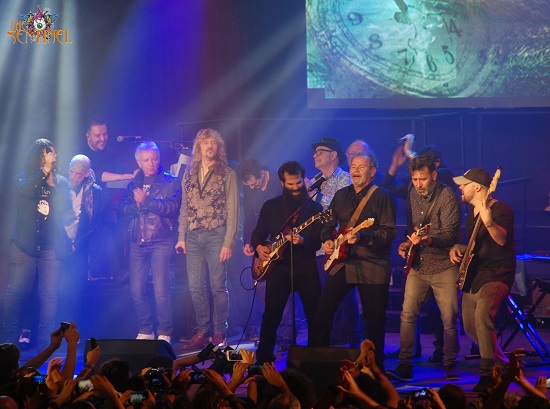 El siguiente invitado fue el más esperado por muchos de los presentes. John Heliwell, mítico saxofonista de Supertramp, interviene en el nuevo disco de Asfalto, en un tema llamado “Melani” cuya letra es una denuncia a la violencia de género. El tema suena mucho a Supertramp, así que Heliwell estaba como pez en el agua. Además de su talento, John Heliwell demostró tener carisma y una gran simpatía. En este tema apareció también Ángel Belinchón, cantante de los castellonenses Dry River, haciendo coros en la parte trasera del escenario. Como homenaje a John Heliwell, Asfalto tocó parte del mítico “School” de Supertramp, desde el puente central hasta el final, con la voz solista de Ángel Belinchón y una interpretación grandiosa de, sobre todo, Arturo García y Nacho de Lucas.