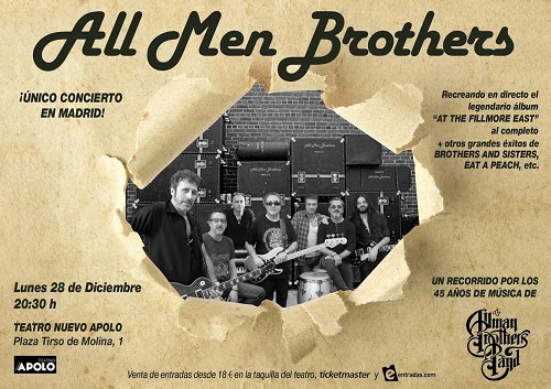 Si tenéis la oportunidad de ver en directo a All Men Brothers Band, olvidaos del párrafo anterior, porque cualquier parecido sería pura coincidencia. Estamos ante un magnífico grupo de músicos de gran nivel que se reúnen de vez en cuando para tocar los gloriosos temas de The Allman Brothers Band, uno de los grupos más clásicos del rock que nunca se asomó a tocar en España, y apenas lo hizo en Europa más que en contadísimas ocasiones. Sus canciones, sus largas improvisaciones y su forma de entender el rock fueron el germen de lo que luego se conoció como rock sureño, además de influir, en mayor o menor medida, en multitud de grupos de varias generaciones. Y como no tuvimos nunca la oportunidad de disfrutarlo en directo, no se me ocurre mejor forma que hacerlo en las personas que forman All Men Brothers, músicos de primer nivel que llevan el rock de los Allman Bros. en las venas.