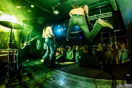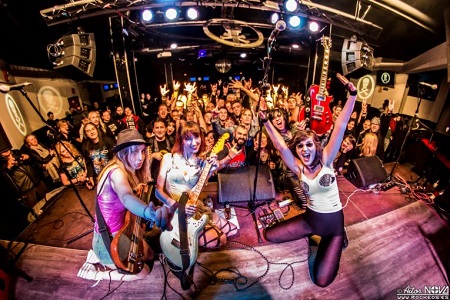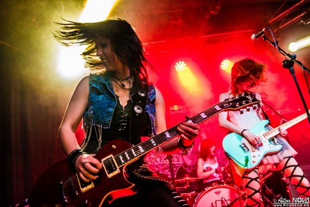 Ashen está ya perfectamente asentada en su puesto de vocalista, guitarra y frontwoman, y comanda a las chicas para que se dejen el alma. Tania acaba de salir del quirófano el día anterior, pero a ésta no la sujetan así la pongan sus ya famosas plataformas de plomo, daría igual, es puro nervio y puro espectáculo, y una vez mas acabó entre el público el concierto destilando rock and roll, ¡bravo Tania! Los palos son de Liv y al loro con ella, cada día me gustan más los coros que hace y las partes que canta, una voz aguda que sale del fondo del escenario y que hace que muchas y muchos de los presentes busquen quien suelta esos gritos y esas estrofas, y descubran a la chica de las eternas gafas de sol pegando duro a su batería y cantando como dios. La última perla de la banda es su guitarra solista, Gemstar, cada día que pasa toca mejor, qué clase tiene, cómo puntea, cómo hace que se fijen las miradas en ella con cada una de sus poses, cómo destila rock and roll cuando brinda birra en mano en el momento de su presentación… sin duda estamos ante la mejor guitarra femenina que haya salido de nuestro territorio.