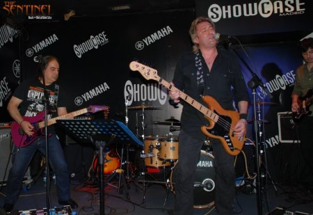 La sala Showcase es muy cuca, con la barra en la zona preferente y el escenario en una esquina (¿no debería ser al revés?) y con sensación de amplitud y limpieza. Tras franquear la puerta y bajar las escaleras que dan paso a la sala en sí, el panorama era desolador. Apenas 4 ó 5 personas estaban esperando a que el grupo telonero abriera la noche. El público iba entrando a cuentagotas, y supongo que ese fue el motivo por el que el grupo invitado, retrasó su salida al escenario. Un error que después se pagó, como explicaré más adelante.