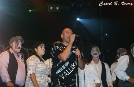 El virtuoso guitarrista Javier Mira hizo su aparición después y, junto a un sorprendente coro llamado Sueño Murguero, de doce personas, se marcaron “Mientras caiga de pie” a ritmo de rap, todos disfrazados al estilo de las chirigotas de Cádiz, fue un momento muy divertido y reivindicativo a la vez. Destacar el feeling de Javier que hizo las delicias del personal al tocar “Mil caras”. Quizás para mi gusto el volumen de su guitarra fue un poco bajo perdiéndose muchos detalles de su ejecución, pero la gente lo estaba pasando en grande.