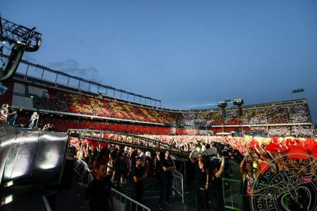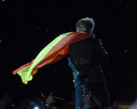 Al final de esta canción llegó ya el turno de la sorpresa de los fans hacia la banda: todo el estadio sincronizado para levantar las cartulinas rojas y amarillas de la bandera de España en la pista y en las gradas un mosaico preparado con un Gracias (por los precios amigo con los que la banda no ha cobrado nada) dibujado en una bandera española y el logo de la banda con el corazón y la daga. Mosaico que se debía mantener durante toda la segunda canción pero dado que mucha parte del público llego a última hora y seguramente no se enteró de todas las indicaciones, el mosaico se empezó a desdibujar al poco. Independientemente, y aunque la banda no se podía parar ahí porque tenían que seguir con el ritmo del concierto y entraron con el segundo tema “You Give Love A Bad Name” sin dilación, fue evidente que les llegó ya que en sus ojos y su sonrisa se vislumbraba la sorpresa y la emoción al gesto. La banda ya adoraba España, pero tras esto Madrid se los metió en el bolsillo. Tras terminar Jon preguntaba absolutamente feliz “are you with me out there?, I know you are”.