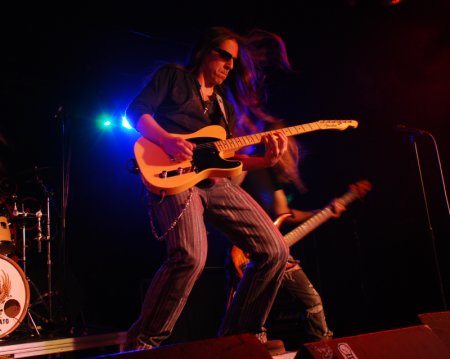 Con Jorge Salán en el escenario apareció con el bajista Luisma Rodríguez (Santelmo) que ha sustituido de manera muy brillante a Fernando Mainer, siempre con una actitud sobresaliente en el escenario y con una calidad indiscutible, y Carlos Expósito (Stravaganzza) a la batería, el genio de las baquetas. Ellos tres formaron un tándem poderoso, y no es de extrañar el éxito cosechado en Europa. Debo decir que Jorge Salán va ganando en seguridad vocal, con un estilo muy personal y lleno de matices. Eligió para la ocasión su Fender Telecaster, en una actuación que no superó los 45 minutos. Defendió su último y mejor trabajo hasta la fecha “Sexto asalto”.