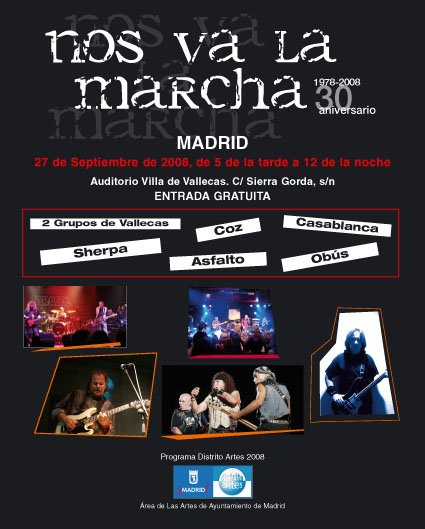 Julio Castejón: Sí, exactamente. Y se fueron cayendo unos por un motivo sensato y otros… mejor no lo valoro. Al final nos quedamos los grupos que están en la página web: Barón Rojo, Sherpa, Ñu, Obús, Asfalto… Pedro Botero, que lo incluimos porque siguen estando en activo, están en Zaragoza y nadie se acuerda de ellos… Casablanca y los Rebeldes, que dijeron que sí, curiosamente fueron los únicos que se apuntaron fuera de los clásicos del Rock. Entonces nos dijimos: creemos notoriedad, hagamos una presentación en la SGAE, invitemos a la Sociedad General de Autores a participar también en todo esto, teniendo en cuenta que, después de todo, en el primer “Nos va la marcha”, estaba Teddy Bautista. Lanzamos toda una publicidad a través de los canales que teníamos a mano. Pero era, obviamente, imprescindible hablar con el Ayuntamiento de Madrid, porque, al fin y al cabo, originalmente fue festival que se había hecho en la Capital, más exactamente en la Plaza de Toros de Vista Alegre (Carabanchel). Era importante confirmar que se haría en Madrid en una fecha preferiblemente próxima a la de la efemérides (22 de septiembre), pensamos que, a partir de tenerlo confirmado en la Capital, lo reproduciríamos en varios sitios. La realidad es que tuvimos una reunión allá por diciembre del año pasado con gente del Ayuntamiento; nos dijeron que la idea les sonaba muy bien, que lo veían aceptable, que sería cuestión de buscar un espacio, un sitio y una forma de hacerlo y que lo definiríamos en enero. Bueno, la confirmación de Madrid tuvo que esperar a finales de mayo. Si no teníamos la confirmación de Madrid, era como que el festival no quedaba refrendado, no tenía sentido que no se hiciera en la Capital y que se hiciera en otras ciudades. Por otra parte, debo reconocer que tampoco despertó excesivo entusiasmo en los ambientes de contratación, y aunque hubo mucha gente que en principio dijo “sí, sí, yo aquí hago un festival…” en Zaragoza, Vigo… varias ciudades que se apuntaron, después todo se fue medio diluyendo, y nosotros tampoco hicimos mucho énfasis porque teníamos todavía dudas de si iba, por fin, a hacerse viable el concierto de Madrid o no. Al final se concretó, pero tras dar muchas vueltas, porque no encontrábamos local donde hacerlo. Primero querían cedernos el Telefónica Arena para hacer un festival que empezara a las 4 de la tarde y acabara por la noche y pasaran todos los grupos. Al final se desestimó porque había trabas por pretender cobrar entrada cuando por otro lado estaba subvencionado por el Ayuntamiento. No queríamos hacerlo gratis. Al final, la única opción posible nos llevo a tener que aceptar un auditorio público, abierto, en medio de la calle, ellos asumen todo el costo del festival pero, claro, tenía que empezar, como muy pronto a las 5 de la tarde y como muy tarde acabar a las 12 de la noche, porque hay vecinos. Y es ese el motivo de no poder contar más que contar con 5 grupos, además del presupuestario, además tuvimos que hacer hueco para meter a dos grupos que han sido finalistas en un concurso de maquetas que ha hecho el Ayuntamiento en Vallecas. Y bueno, la cosa se ha quedado como es. A partir de que se haga este concierto no sé si se animarán otras poblaciones a hacerlo, o si nos animaremos nosotros a repetirlo por nuestra cuenta, no tengo ni idea.