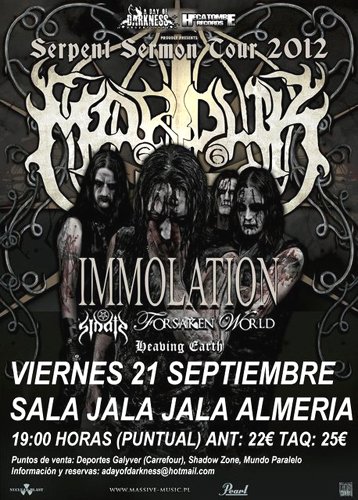 Con unos cuantos meses de antelación se anunciaba que una de las cinco fechas por España que habría del “Serpent Sermon Tour 2012” (uniendo de nuevo de gira a los suecos Marduk y los norteamericanos Immolation) llegaba Almería gracias a los bolsillos de A Day Of Darkness Productions y Hecatombe Records.