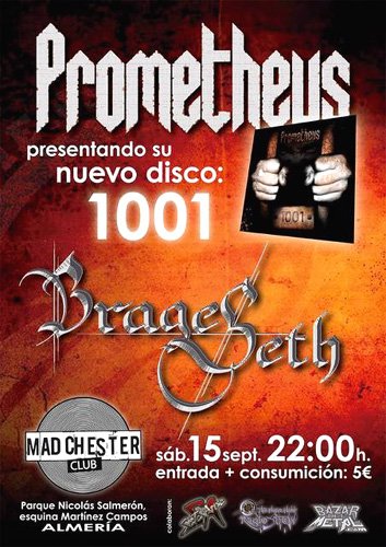 Como en aquel citado concierto, también fue en el mes de agosto cuando me enteraba que la banda de los hermanos Vida (Rafa y José Manuel) regresaban a la capital almeriense, de nuevo acompañándoles los jóvenes de BrageSeth. Al parecer habían hecho buenas migas (¡¡¡y paella!!!) entre ambas formaciones, aunque no hubiera estado nada mal que otra banda se hubiera sumado al cartel, para así darle más atractivo y novedad al concierto. Concierto que coincidía con otro que se realizaba en el pub Radiolab. Si últimamente no hay muchos conciertos de Metal (en el sentido más amplio del estilo) por aquí, no sé cómo se hicieron coincidir las fechas. El concierto del local donde el pasado año tocaban Prometheus + BrageSeth estaba compuesto por dos grupos de la tierra (Disharmonic y Necrosed) y los madrileños Ritual Death, que basan su repertorio en temas de Death. Me hubiera gustado ver de nuevo a las formaciones locales, pero una de tributo como que no, gracias. Habiendo sido más atrayente para servidor que junto a los grupos almerienses hubiera tocado una banda de temas propios de Metal Extremo, que las hay muchas, y de calidad, cerca de Almería (por el Sur, Murcia…), o más arriba de Despeñaperros. Pero claro, lamentablemente parece que hoy en día se hace más caja con una banda tributo que con una “desconocida”… en fin, mejor no seguir escribiendo sobre el tema, pero daría para bastante.