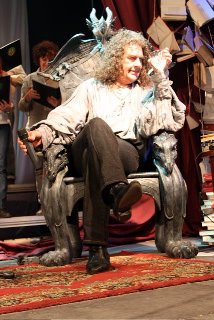 Yo me esperaba un concierto tradicional, con los músicos tocando una sucesión de sus canciones, y con el atractivo de los invitados que estaban anunciados. Pero iba a ser mucho más que eso, algo que pudimos sospechar nada más ver el escenario que se había preparado, ambientado como el salón de un viejo caserón decimonónico. Llegada la hora, los músicos de la banda que acompaña a Miguel Oñate fueron tomando posiciones en cómodos sillones de época. A la derecha, Javier Bermejo a la guitarra. A la izquierda, Jesús Utande al bajo. Y en el centro, en una pequeña batería, Ismael París, a quien no conocíamos hasta la fecha. Sin más presentaciones, empezaron a sonar las primeras notas de “El reposo del guerrero”, mientras que Miguel Oñate aparece, majestuoso, en una actitud muy teatral.