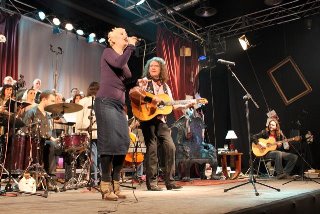 Llegado este momento, Jesus Utande, Javier Bermejo e Ismael París abandonaron momentáneamente el escenario para dejar sólo a Miguel Oñate junto a sus dos nuevos invitados: Lele Laina y José Luis Jiménez, sobradamente conocidos por todos los presentes, ya que las trayectorias de Topo y Miguel Oñate han caminado de la mano en más de una ocasión, siendo habituales las colaboraciones mutuas. Y sin músicos, sólo con la guitarra de Lele, cantaron un pedazo de “Qué es esta vida” para después abandonar esa guitarra y cantar a capella “Sombra y sol”. Y si la idea de cantarla a tres voces y a capella se nos antojaba estupenda, lamentablemente fue lo peor del concierto, ya que la poca preparación que José Luis y Lele llevaron al concierto hicieron que tuvieran que recurrir a leer la letra en un papel (con la mala imagen que genera) y ni siquiera supieran bien donde debía entrar cada uno. Una lástima, porque con algunos ensayos este número del set les podría haber quedado mucho mejor.