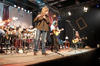 Siguiendo con el detalle de tocar algo de cada invitado, la banda comenzó “Una copa por un viejo amigo”. Nada más empezar a cantarla, todo el público siguió con la primera estrofa, arrancando una mueca de cierta sorpresa en Miguel Oñate, que quizás no esperaba que tanta gente conociera la letra de este clásico de Ñu. O quizás fuera impresión mía. El caso es que evidentemente el siguiente invitado fue el inefable José Carlos Molina, quien no cantó sino que ejerció únicamente de flautista, enriqueciendo la vacilona “Fenicio”, sustituyendo con la flauta el clarinete que aparece en el disco. Este tema siempre conecta de forma especial con el público y esa noche, más que nunca, sonó brillante.