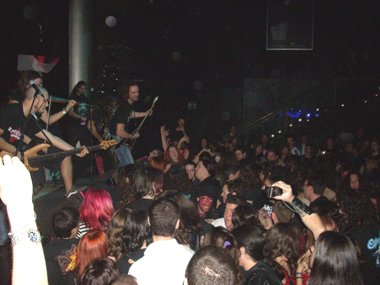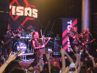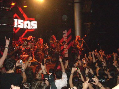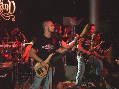 La peña no tardó en hacerse notar de que querían más, con sus voces y los típicos cánticos… volviendo a salir, soltando Mathias un “¡¡¡puta madre, Madrid!!!”. Recordando la fiesta que se pegaron en Murcia (cuando tocaron el viernes 17 de junio del presente año en el Auditorio Municipal de Parque Fofó, con motivo del concurso CreaJoven, y del que resultaron ganadores los speedicos / thrashers Iron Curtain) y en Alicante, nombrando los mojitos, las señoritas… jajaja, comenzando el violín la conocida melodía de… “¡Alcohol, alcohol… hemos venido a emborracharnos…!” coreada y cantada por casi la totalidad de la sala, y el grupo siguiéndola. Pero el ambiente festivo continuó con la versión de “Rasputin” de Boney M, quedando sorprendido de la masiva y loca aceptación del tema discotequero de finales de los 70, aún más seguido que algunos temas anteriores de la banda. Moviéndose al unísono juntos los cuerdas y el vocalista en el centro del escenario.
