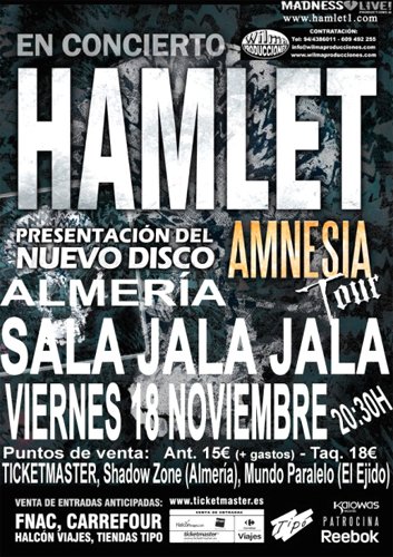 Con la edición de su décimo álbum de estudio, Hamlet se embarcaban en una nueva gira por salas del país, recalando una de las fechas en la ciudad de Almería. Echando la vista atrás en el tiempo, hace tan sólo unos años, los madrileños también habían estado en Almería con motivo de la gira del 15º aniversario, en concreto el viernes 11 de abril de 2008 en la ya extinta sala El Rockero, como ya tereseñé por aquí a su debido tiempo. Descargando también en ese mismo 2008 (el 9 de agosto) en tierras almerienses, en concreto en el IV Desierto Rock Festival de Tabernas, acompañados por bandas locales (13 Nombres, Sourain, Obsidium y Sweetlie). Y más próximo a la fecha que ahora reseñamos, el pasado 9 de julio formaban parte del Sputnik Festival 2011 en Huércal-Overa, con Narco, The Locos, Apeiron y Ska Tó Lógico.