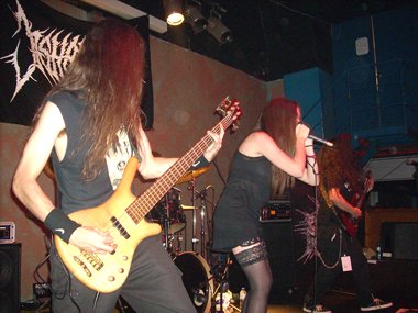 La joven vocalista gritaba “¡¡¡BrutAlmería!!!” y rápidamente, al igual que su debut, desplegaban su vorágine de brutal y técnico Death Metal con “The Earth´s Corner”, encargándose del apoyo vocal el guitarrista Kike. En este primer tema se escuchaba más la batería programada que el bajo y la guitarra, un defecto que prosiguió prácticamente a lo largo del concierto, quedando así empañada la buena descarga del terceto. Quizá ese error se hubiera solucionado si hubieran tenido tiempo de hacer pruebas de sonido, algo que no llego a entender por parte de la organización llevando ya seis ediciones de festival, o podríamos mejor echarle la culpa al técnico de sonido que normalmente se encarga de llevar los controles en esa sala. Porque si servidor, sólo con un oído enfrente del otro, está delante de la mesa de sonido y se da cuenta de las carencias, ¿cómo esa persona, que se supone entendida, no repara según se va escuchando el concierto?