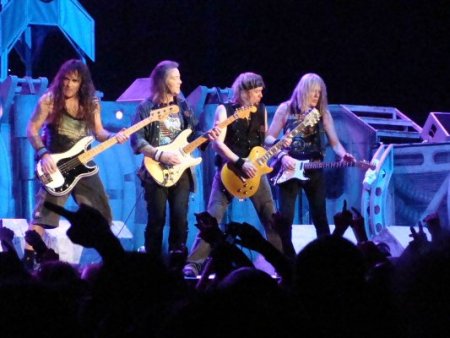 Desde el principio pudimos comprobar que la banda sigue mostrando su habitual entrega y profesionalidad, con Steve Harris, y Bruce Dickinson – bastante bien de voz con un repertorio muy exigente – recorriendo el escenario de un lado a otro de manera constante, Janick Gers jugando con su guitarra en su lateral, Adrian Smith y Dave Murray más estáticos en el suyo y Nicko McBrain marcando el ritmo sin descanso. Lo habitual, pero no por ello menos bienvenido. Sigue alegrando ver a la banda en un estado de forma excelente, aunque quizá empezasen a acusar el cansancio de una gira bastante larga (Bruce Dickinson cambió alguna melodía vocal en el bis en Sheffield y la segunda noche en Londres y Steve Harris lució en varias fechas una rodillera debajo de sus bermudas y dosificó sus carreras por el escenario).