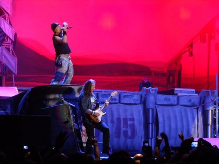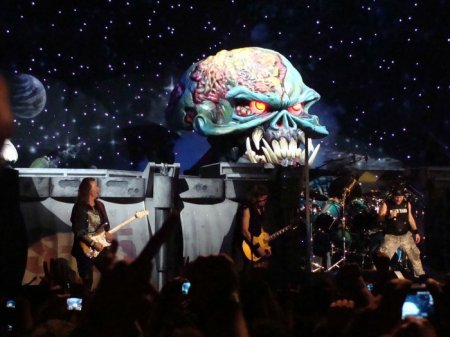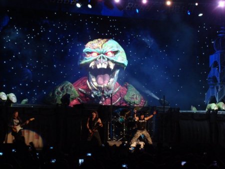 En cuanto a Iron Maiden, todos los días comenzaron sus conciertos con puntualidad británica a las 20:45. “Doctor, Doctor” de UFO animó al personal antes de pasar a la introducción propiamente dicha, la misma que abre “The Final Frontier”, acompañada por un vídeo de ciencia ficción proyectado por las pantallas situadas en los laterales del escenario y un juego de luces espectacular. Tras ello, explosión de sonido y salida de la banda con “The Final Frontier”, con ese aroma a los UFO de los 70. La segunda en sonar fue “El Dorado”, crítica a la banca recibida como si de un clásico de hace 25 años se tratara, y en la que Bruce Dickinson, ocultando su cabello cada vez más gris con un gorro de lana, aprovechó para hacernos gritar por primera vez (“Scream for me Sheffield / Nottingham / Cardiff / London!”) mientras recorría las pasarelas superiores del escenario.