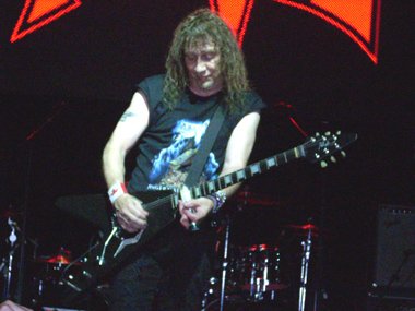 El trío estaba sonando realmente bien, duros, compactos, y directos con su potente Hard Rock o Rock Duro. Durante parte de “Devil´s Child” pudimos ver y escuchar en plena acción y poderío vocal de registro agudo al bajista Gary Bordonaro, enlazando el tema que apareciera en aquel “Live” (Combat Records, 1983) – disco con los que descubrí al trío gracias al vinilo que se compró el amigo Antonio “Lelo” en la desaparecida tienda de discos Radyelec – con el tema-título “Let Them Eat Metal”seguido de “Born To Rock”.