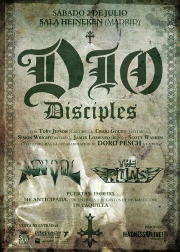 Cuando la mayoría de peña ansiaba que llegara el festival Sonisphere para ver a Iron Maiden, o el “Epitaph World Tour” para asistir a la supuesta despedida en directo de Judas Priest… servidor tenía más que claro cual iba a ser el concierto del verano para uno. Pasando de masificaciones y organizaciones precarias de festival, y pasando de acústica deficiente en La Cubierta, entre otras grandes razones. Cuando se anunció que la banda de homenaje al añorado y gran Ronnie James Dio, Dio Disciples, vendría acompañada por Anvil y The Rods, mi objetivo era acudir a Madrid a ver principalmente al trío norteamericano que, si no me equivoco, era la primera vez que tocaban y realizaban una gira por suelo hispano, y volver a ver a los canadienses tras aquel gran concierto que disfrutamos unos pocos en en el Lorca Rock 2006. Atrás quedó abortada la visita que iban a realizar el año pasado Anvil junto a Ratt.