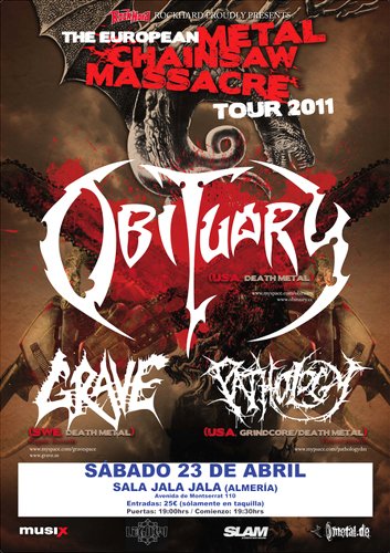 En la anterior visita de Obituary (septiembre de 2010) uno de sus conciertos fue en Granada. Ciudad que se había vuelto a elegir en un principio para una fecha de esta nueva gira europea y española, pero después no sé por qué razón se trasladó a Sevilla, siendo luego cancelado el concierto en la ciudad hispalense. Al final, pendiendo de la suspensión de la fecha por el Sur, y con tan sólo tres días de antelación, Madness Live! Productions y A Day Of Darkness Productions anunciaban que el concierto se realizaría en Almería. Para el que suscribe mejor, porque realmente no me hubiera desplazado ni a Granada, y menos a Sevilla, a ver los tres grupos que componían el cartel, pero teniéndolos a unos cuantos minutos de casa, pues habría que volver a ver a Obituary y Grave, por segunda y tercera vez, respectivamente, y por primera a Pathology.