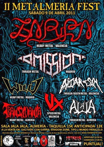 La premura que se dieron los de la asociación MetAlmería a la hora de anunciar las primeras bandas para el “II MetAlmería Fest.” no sirvió de mucho, ya que a los pocos meses se caían del cartel los almerienses Inercia tras anunciar su disolución. Más adelante Nocturnal decidían también descolgarse del festival en el sureste de España, cuando al parecer estaba todo tratado con la asociación según ésta, dejando así a los almerienses, como se suele decir: “compuestos y sin novia” (iba a ser la primera banda internacional que traían). Desconocemos la versión de los germanos, pero prefirieron tocar un mes antes en El Prat (Barcelona). Así que de las tres formaciones anunciadas con bastante antelación sólo permanecían VX… confeccionando al final un cartel bastante bueno (con cinco grupos nacionales y dos de la tierra), a pesar de no haber ninguna novedad para servidor, quien ya había visto a todas las bandas no mucho tiempo atrás. Finalmente también la fecha anunciada al principio cambió, adelantándose una semana, del sábado 16 al sábado 9 del abril.