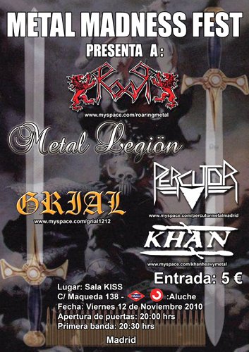 Últimamente, ante mi escasez de subidas a la capital del país, cuando viajo allí intento como me es posible poder ver al menos un par de conciertos. En esta ocasión mi viaje era principalmente para poder asistir el sábado al “Thrash Clash 2”: Legen Beltza + Omission + Redimoni + Demonished en la sala Ritmo y Compás. Pero semanas antes me enteraba que el día anterior había un concierto bastante atrayente de nóveles (la mayoría) formaciones metálicas ubicadas en Madrid. Así que pudiendo viajar el viernes, no me lo pensé mucho y además me venía bien para descansar algo ante la cita del sábado y no bajarse del autobús y prácticamente unir la dejada de equipaje con la ida a Ritmo y Compás. Y aunque en la oferta de conciertos del viernes había algún que otro bolo que podría ser interesante (¿y cuándo no en Madrid?, y más si gustan estilos diversos dentro de lo que es el Rock y Metal, como a servidor), me atraía bastante más ver a cada uno de los grupos que descargarían en la sala Kiss. Habiendo sólo tenido la oportunidad de ver de todo el cartel a Roar, en el pasado Pounding Metal Fest., como ya reseñé en su momento en esta modesta casa.