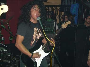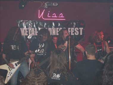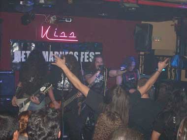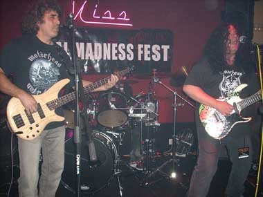 El vocalista Jaime (Khan) me había informado muy amablemente días antes que se tenía previsto abrir las puertas sobre las 20.30 h., comenzando la primera banda, precisamente Khan, una hora después. La sala Kiss (aunque luego viéndola, más bien servidor lo llamaría pub, pero es la costumbre de hace unos años de llamar a ciertos garitos y antros, salas, pero bueno, así está la cosa) está situada en el barrio de Aluche, y como no controlo esa zona de Madrid, pillé el Metro de Pirámides hacia Aluche con tiempo de sobra. Una vez llegado a la parada de Aluche, y salir a la calle, comenzé a preguntar por la calle Maqueda, y a la segunda persona que abordé me indicó que estaba justo al cruzar el semáforo. Bien, pues ahora a ver si había que andar mucho, o no, para dar con el número 138 de dicha calle. Nada más empezar a adentrarme por la calle me doy cuenta que por allí había estado anteriormente para ir a la sala Live! y a la sala (mejor decir, pub) The Bank. Perfecto, y mejor aún cuando apenas habiendo andado un poco hallo la Kiss, estando ya peña esperando la apertura de puertas. Me apoyo en un coche, tras haberle preguntado por la hora de comienzo a un tipo de los que formaban uno de los grupos que estaban allí. Al ratillo llega alguien que conozco, el bueno de Dani Masa, y llevando un agradable rato hablando, por allí aparece también Jaime (Khan), saludándolo y conociéndolo en ese instante personalmente. Minutos después salen del bar que está pegado a la Kiss, Mr. Vadillo y compañía. Más saludos, charla y… ¡¡¡vamos para adentro, que por fin se puede entrar!!!