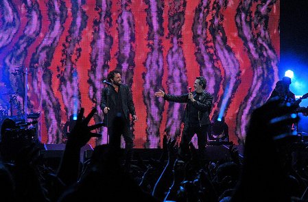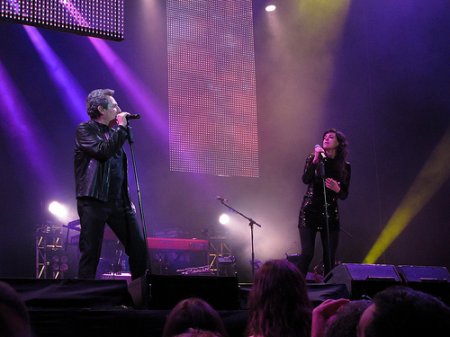“Nos siguen pegando abajo” sirvió de puente hasta la llegada de los siguientes invitados, el dúo Amaral, que acababa de recoger el “Premio Nacional de las Músicas Actuales” del Ministerio de Cultura. El dúo zaragozano cantó con Miguel el otro homenaje a su ciudad natal, “Al sur de Granada”, de nuevo con imágenes alusivas en las pantallas de vídeo.