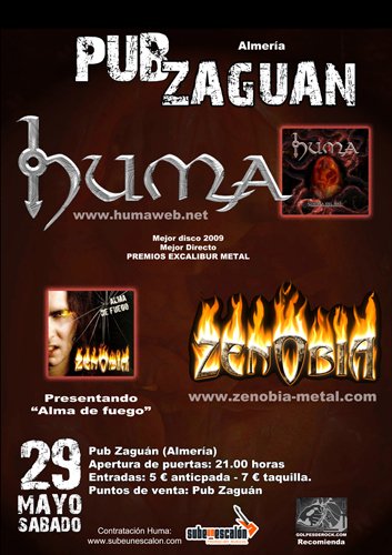 Me sorprendía que Huma volvieran a Almería, y más en concreto al mismo garito donde hace poco más de un año tocaban presentando su segundo disco, “Semilla del mal” (2009). Y a pesar de que seguro que no habría muchas novedades en su repertorio, al menos podíamos disfrutar de nuevo del buen hacer del ahora sexteto. Si el año pasado al final tocaron solos, por no poder hacerlo los roqueteros Alaja, esta vez venían acompañados de Zenobia presentando su buen segundo álbum, “Alma de fuego” (2009). Así que la noche del sábado se presentaba bastante atrayente con un cartel de dos formaciones de Heavy Metal que día a día, ensayo a ensayo, concierto a concierto… van convenciendo a más gente de su valía.