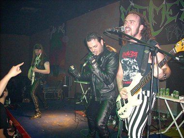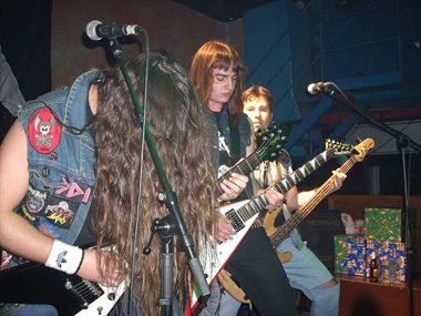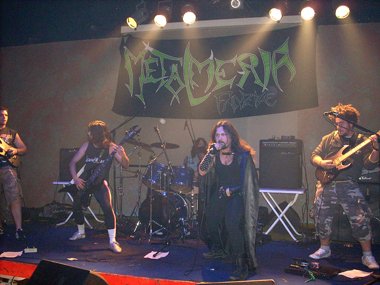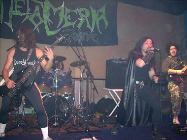 Tan sólo unos diez minutos después ya tomaban el escenario los jóvenes heavy metaleros Transylvania. Comenzando “Mercenario” los guitarristas Juanetes y Carlos, el bajista Cristo y el batería Dani , saliendo al instante Alberto con su capa (tendremos que apodarlo “Super Alberto” o “Conde Alberto”, jejeje). Buena elección para empezar, con la mejor canción de su hasta ahora única grabación, la maqueta “Cinco segundos” (2006), que hizo que la chavalería empezara a practicar esos empujones que aparecen ya hasta en los conciertos de Heavy Metal (¡qué vuelvan los tiempos pasados, coño ya, jajaja!).