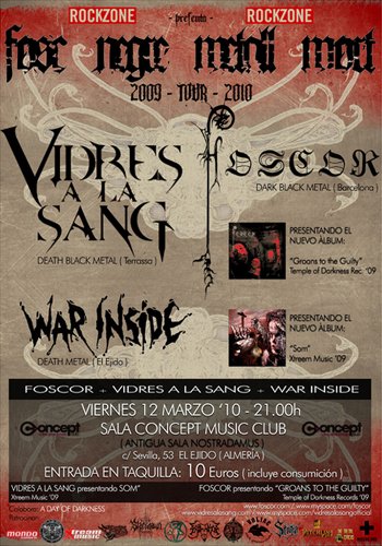 Para esta ocasión el cartel me parecía bastante atrayente, recalando en tierras ejidenses la gira conjunta que están realizando por la Península Ibérica (más una primera fecha en Toulouse, Francia a comienzos de diciembre pasado) las dos bandas catalanas: Foscor y Vidres A La Sang, bajo el nombre de “Fosc Negre Metall Mort Tour 09-10”.