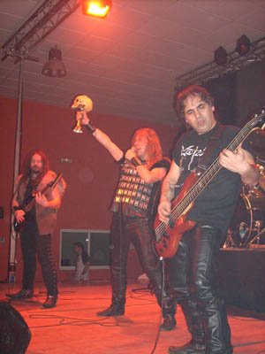 En la recta final tocaron “Hussard De La Mort”, “Ithaca”, donde durante la parte instrumental el guitarrista Mario Degiovanni, ataviado con una camiseta negra con el logo de Manowar y un chaleco de pieles (del cual se despojó en estos últimos temas), tomaba el centro del escenario en el solo, perdiendo su mirada en la lejanía, como le habíamos observado a lo largo de todo el concierto. El vocalista en esa parte instrumental abandonaba las tablas, regresando con una capa y un cascoalado, a lo Thor para enlazar y hacer “Lord Of The Wind”. Hincándose de rodillas al final asiendo el hacha.