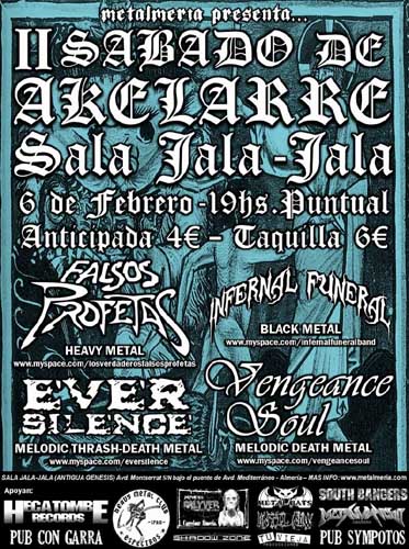 Primer concierto organizado este año por la ya constituida asociación MetAlmería. Tomando la idea del bolo montado en mayo del pasado año por el grupo Infernal Funeral bajo el nombre de “Sábado de Akelarre”: Noctem + Morvity + War Inside (contado a su tiempo por estos lares), la gente de MetAlmería decidieron hacer la segunda edición y tener la deferencia y el gran detalle de incluir en el cartel a los blackers Infernal Funeral, ya que en el “inicial Akelarre” no pudieron tocar.