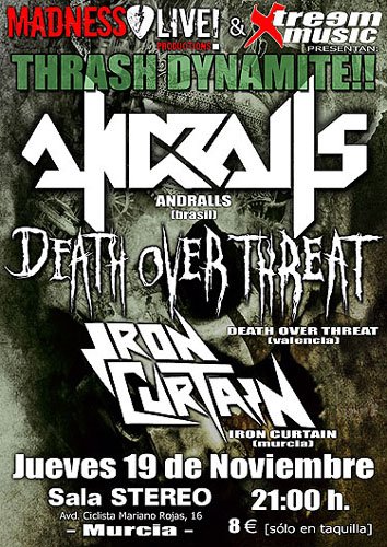 Los thrashers brasileños Andralls, después de su primera gira europea (“Noiséthrash Tour 2006”), afrontaban su segundo tour por el viejo continente durante noviembre y diciembre (“Let´s Kill Again European Tour 2009”), presentando su cuarto disco de estudio “Andralls” (2009). Tras los cuatro conciertos iniciales de la gira por territorio italiano, recalaban en nuestro país, siendo la primera vez que tocaban por nuestro territorio, realizando seis fechas (Palencia, Madrid, Murcia, Valencia, Torelló y Zaragoza).