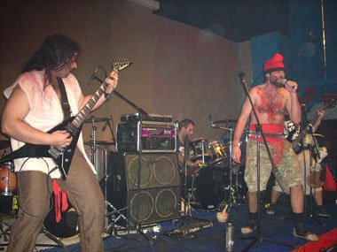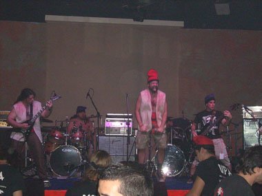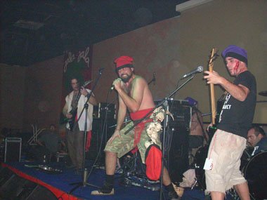 Prácticamente cada canción era presentada con historia cachonda por parte del gruñidor, así “Masovera caníbal”, primer corte del disco “Tots trempant!!!” (Voliac Rock Produccions, 2008), no fue menos. Pasándose Roger el cable del micro por el “arco del triunfo” durante la canción. La voz seguía escuchándose un tanto baja respecto a la demencial música del cuarteto catalán (faltaba uno de los guitarristas).