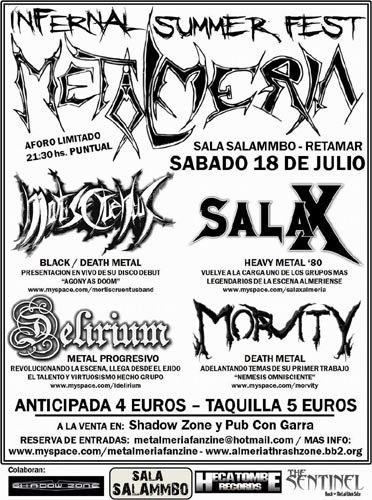 Cuando aún estaba muy reciente el recuerdo del I MetAlmería Fest los chicos del fanzine MetAlmería se liaban la manta a la cabeza y a finales de mayo hacían público el segundo festivalillo organizado por ellos mismos. Bajo el nombre de Infernal Summer Fest (¡viva el idioma de Shakespeare!) se anunciaba el pequeño sarao para el 18 de julio (tres meses después del anterior festival) otra vez con un precio bien barato (4 € anticipada y 5 € en taquilla) y con el cartel compuesto por tres grupos almerienses: los heavy-rockeros Sala X, los death metaleros ejidenses Morvity, y el trabajado y melódico Heavy Metal de Element Zero. Y como banda de fuera de nuestra provincia los murciano / alicantinos de Mortis Cruentus. Para servidor el atractivo estaba en volver a ver a la banda de Black / Death, habiendo tenido antes la oportunidad de comprobar su directo en el primer festival organizado por la asociación murciana Heavy Metal Espectros a comienzos de febrero de 2008 (en los archivos anda la reseña de aquella noche). También me agradaba poder ver de nuevo en directo a Element Zero, los cuales me habían causado buena impresión cuando los veía hace años en la difunta sala El Rockero.