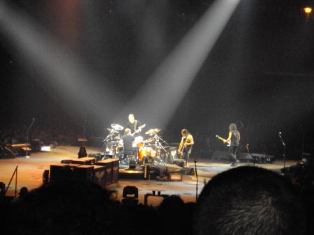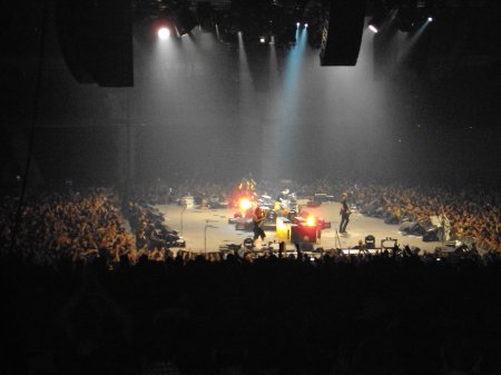 Como no me llevé nada para ir tomando notas, espero no equivocarme con el orden (tengo la memoria de aquella manera…) (*), pero de repente se apagaron las luces y desaparecieron del escenario, empezaron a sonar tiros y explosiones pregrabadas, acompañadas de efectos pirotécnicos (llamaradas que salían de los huecos abiertos en el suelo del escenario al efecto), que indicaban que “One” sería la siguiente… pero no. Cuando volvieron al rectángulo central sonaron los acordes iniciales de “Fade To Black” con lo que nos quedamos con dos palmos de narices. No es que se prefiera una a la otra o viceversa, es que no son incompatibles y nos pusieron la miel en los labios para quitárnosla de sopetón, por mucho que apeteciera escuchar también la del “Ride the lightning”. Quedó bastante mal el invento.