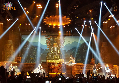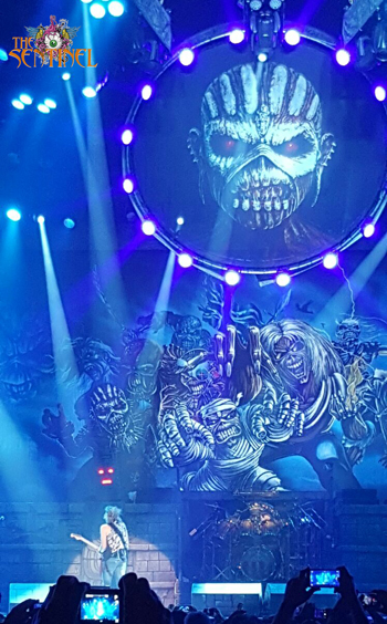 En los primeros minutos el sonido no terminaba de estar apunto, en especial para las 3 guitarras, pero después se fue solventando. La banda sonaba como un cañón. En un estado de forma envidiable, todos ellos se estaban dejando la piel para ofrecer lo mejor de sí mismos. Si bien Adrian Smith y Dave Murray siempre han sido más estáticos, Janick Gers sigue siendo una cabra loca. No para de hacer diabluras con la guitarra, saltando, bailando y haciendo piruetas sin parar. Eso le lleva a hacer menos solos que sus dos compañeros, pero su presencia escénica es inmensa. Steve Harris ya no corre sin parar como antaño debido a sus problemas de espalda, pero se mueve con soltura, además de no desfallecer ni un momento con el bajo. También impresiona Nicko McBrain con su imponente set de batería, que aporrea con la misma energía de siempre. Las grandes pantallas de vídeo de los laterales nos ofrecían muchos primeros planos en los que se podía observar que, además, no para de gesticular y bromear durante todo el concierto.