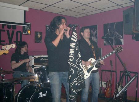 Los que estábamos allí para ver al grupo insistimos pidiendo otra, otra… y ellos insistían en pedir copas. Hablando del elixir, madera… pasando a tocar la primera canción que hicieron hace doce años, “Quizás mañana”, dedicada al Jack Daniels. El bajista acabó el tema gritando: “¡Viva la Pepa!” (en alusión a la camarera que por fin les había servido las cinco copas).