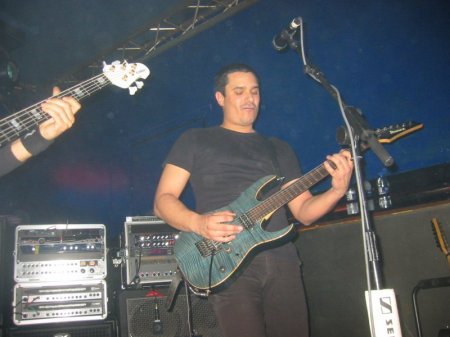 Cuando llegué a la prueba de sonido, me encontré con que la batería estaba casi montada y cada uno buscaba su hueco. Yo estuve compartiendo lado con el equipo de Gustavo, ya que nuestros Marshall son modelos de 1 ó 2 luces en el frontal a lo sumo; y dejamos el lado opuesto del escenario al otro equipo de guitarra y el del bajo, que si los miras de frente, y guiñas un poco los ojos (como cuando se veía el plus codificado), puede parecer que estás viendo un par de edificios de la zona business de Tokio. Cada uno llevará 200 ó 300 leds indicadores (así, a ojo… sin exagerar), así que Gustavo y yo decidimos quedarnos en la zona “oscura”.