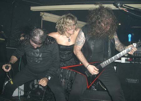 Pablo hacía que siguiéramos con nuestras voces el ritmo de su batería, para luego desembocar el pequeño solo de batería en el comienzo del “Painkiller” acompañado por Luirry, pero ahí no acabó la cosa, siguieron con recuerdos y fragmentos de Pantera, Metallica, Slayer… y una gran emoción me invadió al escuchar la guitarra de comienzo de“Reencarnación” que tocaron entera, y yo alucinando y cantándola. Menos mal que hicieron algo de Santa, porque si no hubiera estado dispuesto a dar la lata, jejeje. Y es que además de que la voz de Gloria nos recuerda en ocasiones a Azuzena, el 30 de enero tuvo el honor de rendirle homenaje en el concierto realizado en la sala Ritmo y Compás de Madrid.