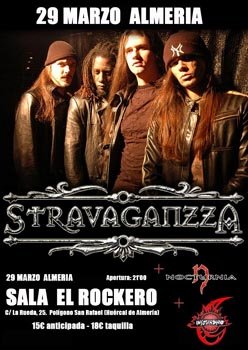 El concierto de esa noche no me atraía apenas. Seamos realistas, no me hubiera desplazado muchos kms. para verlo. Pero recalando en Almería pues era una oportunidad para ver qué tal se desenvuelve el vocalista Leo (ex–Saratoga, Alborde) con Stravaganzza. Mucha gente, especialmente chavalería, fue idolatrando al vocalista cada vez más, estando en Saratoga. A mi, tras su disco de debut con la formación madrileña, cada vez me fue gustando menos, tanto musicalmente la banda, como el timbre de voz de Leo, no gustándome apenas sus agudos. Tampoco había escuchado a conciencia a Stravaganzza, no resaltando mucho para mi la música que realizan, de sonidos oscuros, actuales y de aires algo sinfónicos.