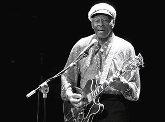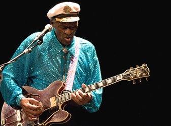 Al salir al palco de butacas sobre el escenario ya estaba el Papá del Rock & Roll, con su camisa azul de lentejuelas, gorra marinera, pantalones negros y su Gibson colgada, junto a su banda de acompañamiento (pianista, baterista, guitarrista, y bajista) interpretando el comienzo de la clásica “School Days”, pidiendo que cantáramos con fervor el estribillo. Fue acabar el tema y una gran ovación se escuchó, poniéndose un buen número de gente en pie aplaudiendo.