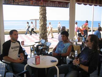 La fiesta llegaba a su fin, y de nuevo tocaba hacer el viaje de vuelta, esta vez desde más lejos, puesto que Madrid está a una buena tirada desde Almería. El cansancio es entonces cuando se hace más patente, en la vuelta… Antes de marchar dio tiempo para pasar por la playa y hacer un desayuno con vistas al mar, algo deseado para todo bicho de secano. Ya en Madrid, deprisa y corriendo para meter los trastos de vuelta al local y devolver la furgoneta en tiempo para no correr con más gastos de retrasos. Una vuelta por un par de garitos y dejar unos carteles para la próxima presentación en Madrid y directos al sobre para aguantar una semana de correspondiente trabajo profesional. A veces compaginar la profesión con el amor musical es complicado, pero es el pan de cada día.