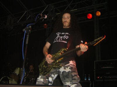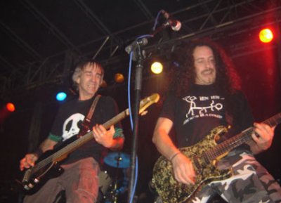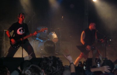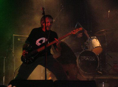 Guiños a su primer disco con “Tío Sam”, con la pega que a la voz de Rafa Redín apenas se la escuchó por problemas en su micro (supongo), todo lo contrario que a Brigi, el cual estuvo perfecto durante toda la noche, y mira que el tío debería de terminar cascado con toda la tralla que le mete a sus cuerdas vocales. Se le ve en muy buena forma. Al finalizar este tema empezó el desfile de espontáneos subiendo al escenario para participar del evento. El primero fue un tal Manolo (él mismo se presentó), tuvo su minuto de gloria y se quedó tan contento, hasta el propio Brigi bromeó con el sujeto. Pero qué queréis que os diga, a mi no me gustan este tipo de actitudes, cierto es que los conciertos de Koma son cañero-festivos a tope, pero pienso que no hay que entorpecer la labor de los músicos. No digo con esto que, por ejemplo, en el último tema y cuando el concierto esté acabando sí que se pueda subir gente y terminar con un desparrame total, pero repito, durante el resto del concierto habría que ser más respetuoso y dejarles hacer su trabajo, ya que de esta forma todos saldríamos beneficiados. En cualquier caso la última palabra la tienen ellos, aunque poco pueden hacer más que mantener el tipo cuando la gente invade el escenario. Cierto es que hubo un miembro de las Txoznas que en todo momento intentó mantener a raya a los intrusos, pero su trabajo le costó.