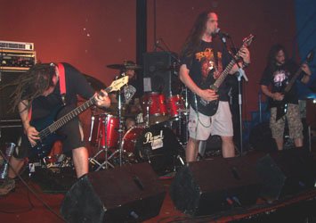 Tocaron tan sólo cuatro temas, el segundo fue “Trip To Hell”, éste más Thrash Metal, que con el que abrieron (y el cual desconozco su título), que me pareció más Death Metal. Enredándose el pelo del bajista Raúl con la pala del guitarrista Freddy (que apoyaba con voz gutural). El vocalista con fuerte acento granadino daba las gracias a Pedro y a la gente de la escena, para seguir con “Storm From The Past”, alternándose las voces de Eddie y Freddy. El tema con el que se despidió el quinteto fue la versión de “Slaughter” de Pantera.