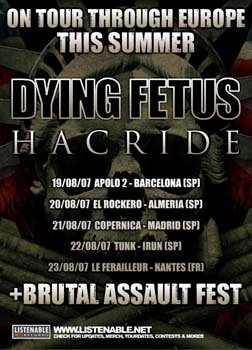 En un principio se anunció gira conjunta de Dying Fetus y Cephalic Carnage, pero finalmente en julio se informó que los segundos no venían y eran sustituidos por Hacride. Una decepción para muchos la noticia.