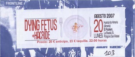 El programa cultural programado para las fiestas de la ciudad no tenía nada de Rock ni por asomo, mucho menos de Metal. Pero la promotora Frontline traía a España la gira de los norteamericanos Dying Fetus y por primera vez contaban con la sala El Rockero para un evento de tal magnitud. El local se abría expresamente para la ocasión, puesto que estaban de vacaciones, ya que la temporada conciertil había acabado el pasado junio, aunque ya estábamos informados en mayo de este concierto.