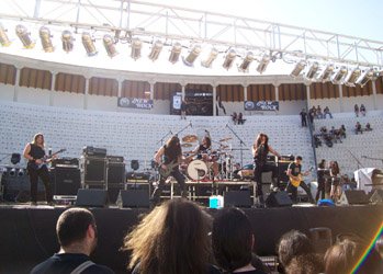 Entrando a la plaza desde una de las entradas a uno de los tendidos, cuando faltaban diez minutos para las siete de la tarde, el sexteto alicantino DINASTY comenzaba con la power/speedica “Legacy Of Blood”, tema que dará el título a su futuro primer disco. El astro rey estaba en todo lo suyo quemando y picando que daba gloria. Vislumbramos desde lo alto al amigo Pepe, así que bajamos al ruedo, y junto al amigo Pedro, nos situamos en algo de sombra escorados hacia el lado izquierdo frente al escenario.