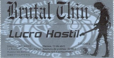 Por fin iba a lograr ver a los gaditanos Brutal Thin´ en concierto, oportunidades había tenido, pero por unas cosas u otras nunca había podido disfrutarlos en directo. La última ocasión me dio mucha rabia, ya que me enteré que habían tocado en la sala Génesis de la capital (si mal no recuerdo a finales del año 2005) al ver un triste cartel cerca de dicha sala cuando ya había pasado el concierto (¡esa publicidad desastrosa!). Y otra jugosa atracción era la despedida de Lucro Hostil. Me enteré de que sería su último concierto en el foro de la página de El Rockero, puesto que el guitarrista Koyote había puesto un post un día antes anunciando la noticia. Me sorprendió la decisión, aunque a decir verdad poca información había tenido de este grupo, y es que a veces es increíble que uno pueda enterarse de grupos de otras ciudades e incluso países lejanos, y de la mayoría de las bandas de la tierra de uno saber poquita cosa. Es más, por el nombre siempre había creído que era una banda de Punk Rock, y cuan equivocado estaba, esa noche me sorprendieron muy gratamente con su Heavy Metal ochentero.