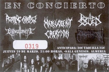 A Day Of Darkness Production y la distribuidora Broca (vamos, dicho más familiarmente, Juan Carlos Navarro, Manu y Dani) volvían a sorprendernos y traer a la tierra de Bisbal una fecha del “Theogonia: Doomsday X Tour”, encabezada por los griegos Rotting Christ y los norteamericanos Malevolent Creation, grupos de renombre en el llamado Metal Extremo. La gente respondió a la cita, siendo la fecha en España que más llenó (el martes habían tocado en Barcelona, el miércoles en Madrid, y tres días después al visto lo harían en Irún), aunque eso sí, con bastante gente venida de fuera de la provincia. Se intentó que los almerienses Reincarnation abrieran la demoledora velada, pero al final no pudo ser y se llegó a tachar su logo de las entradas. Y puestos a quitar cosas, se debería haber descolgado una larga bandera de Argentina que presidió todas las actuaciones del grupo al fondo del escenario, y es que allí se había organizado una fiesta para gente de aquel país días antes.