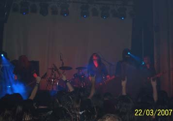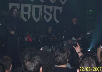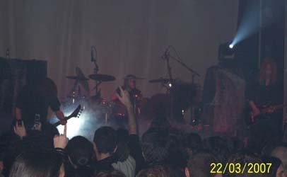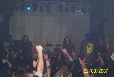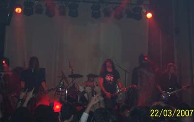 Antes de que empezaran los suizos me encontré con Miguel A. Hernanz (Omission, ex–Muro, Crienium) y charlando me dijo que le habían desilusionado los suizos en su participación en el Wacken, con ritmos super lentos y costando adivinar las canciones antiguas. Bueno, a mi el concierto de Madrid me gustó (a pesar de tener un sonido mejorable, pero es que lamentablemente ese tugurio no da más), incluido ambiente lúgubre conseguido por las luces y el telón con logo del grupo, y aunque al principio estaba un poco descolocado, tema a tema me fueron gustando cada vez más, incluso su concesión a ritmos más densos y lentos de los dos temas que tocaron del “Monotheist”. Eso sí, Warrior pasota y frío como el solo. Habría que volverlos a ver en una sala en condiciones y en su gira, aunque en España eso creo que va a ser difícil.
